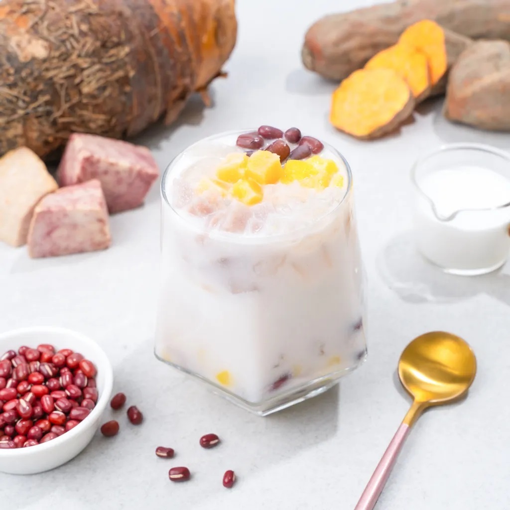 ● 精選富有特殊香氣南洋菠蘿蜜,搭配透明軟Q亞答枳,以及地瓜丁、芋頭丁、QQ 果、紅豆,最後加上香濃滑順椰漿。
