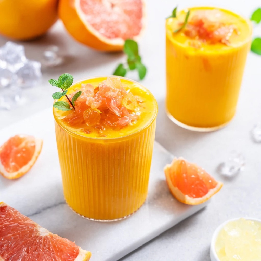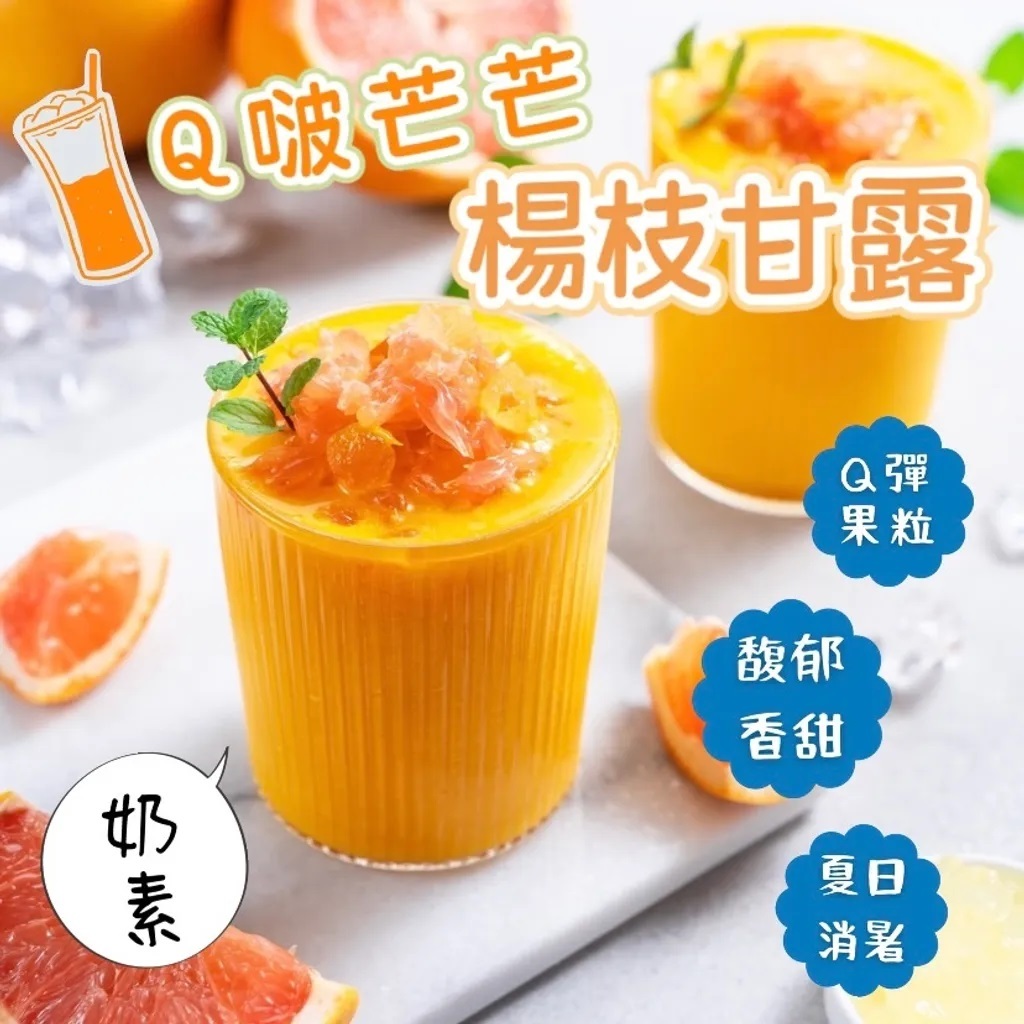 ● 嚴選台灣愛文芒果做為基底,搭配酸甜紅柚果肉,濃郁香甜中帶點微微的酸再放進 QQ 果,入口後能品嚐到豐富的層次感,香濃滑順的椰奶與鮮奶油更是讓整體香氣更一層樓,是一道非常可口的消暑聖品。