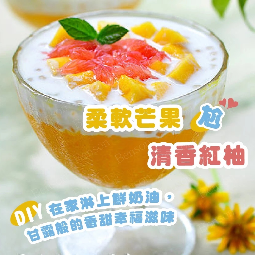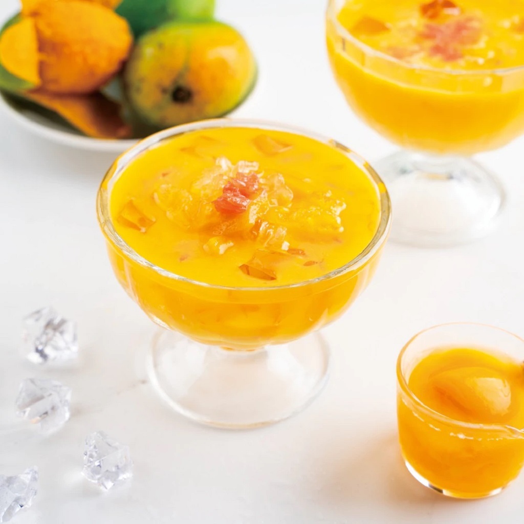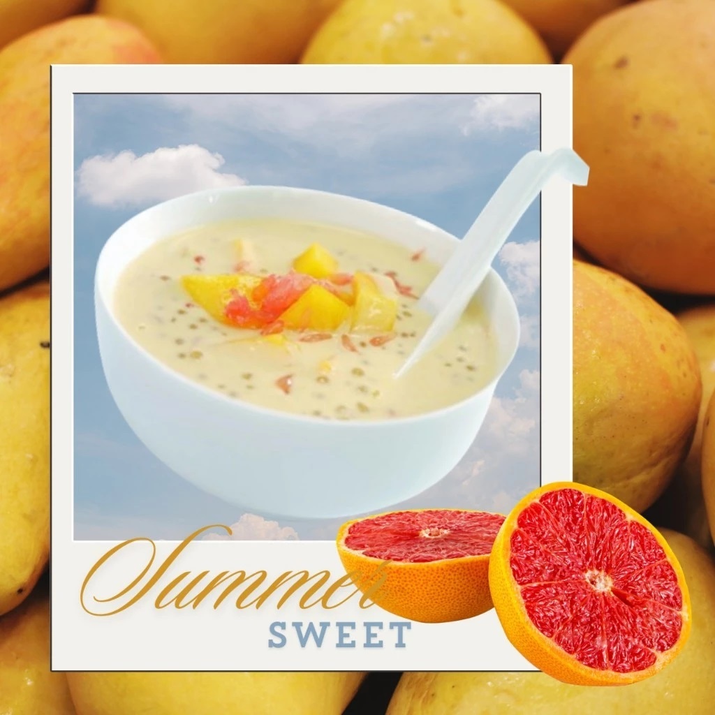 ● 香澄芒果搭配酸甜紅柚果肉,香甜中帶有刺激味蕾的迷人微酸,QQ 果增添咀嚼趣味,滑順椰漿與香濃鮮奶油增添香氣,是一道南洋風情的消暑聖品。