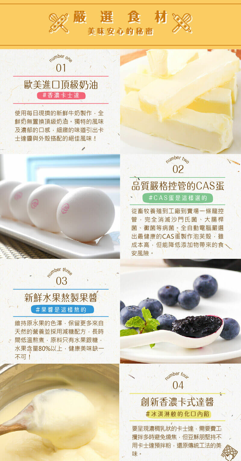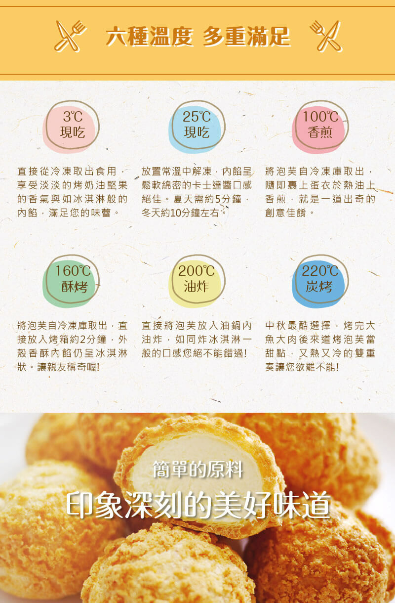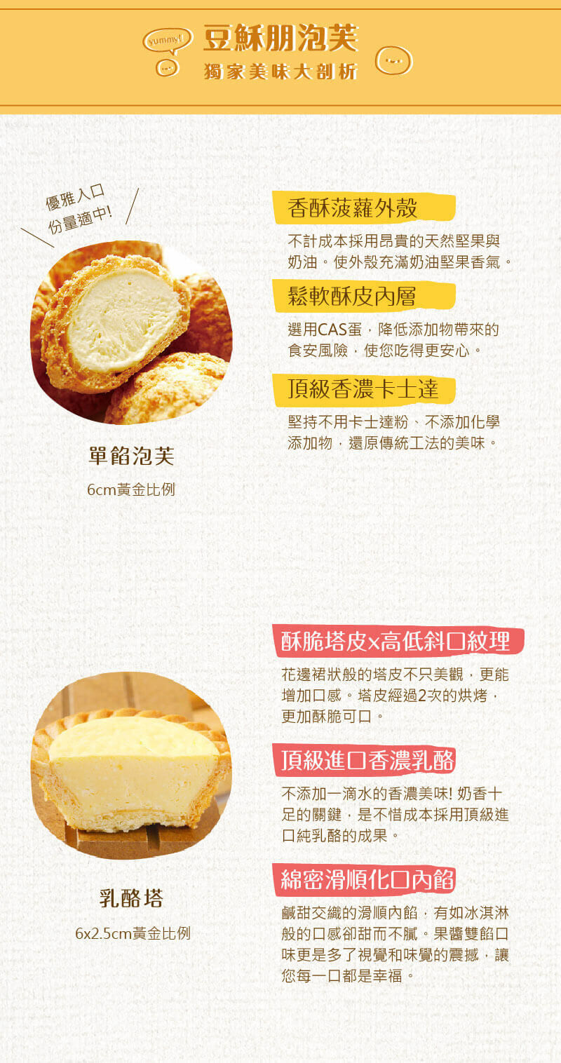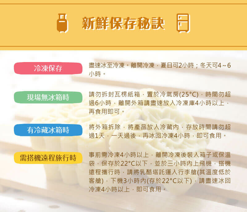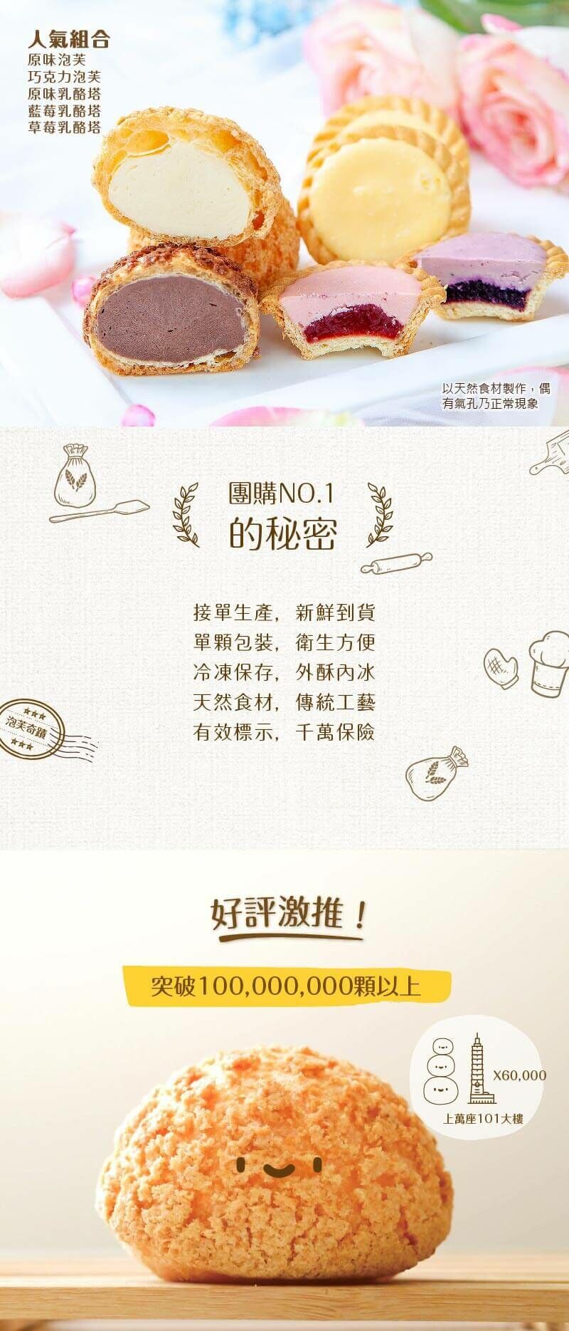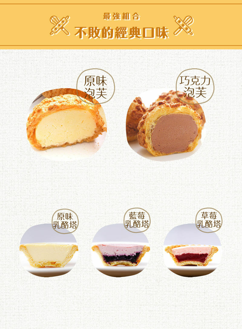 最佳賞味期:泡芙冷凍10天/乳酪塔冷凍30天/奶蛋素食可食