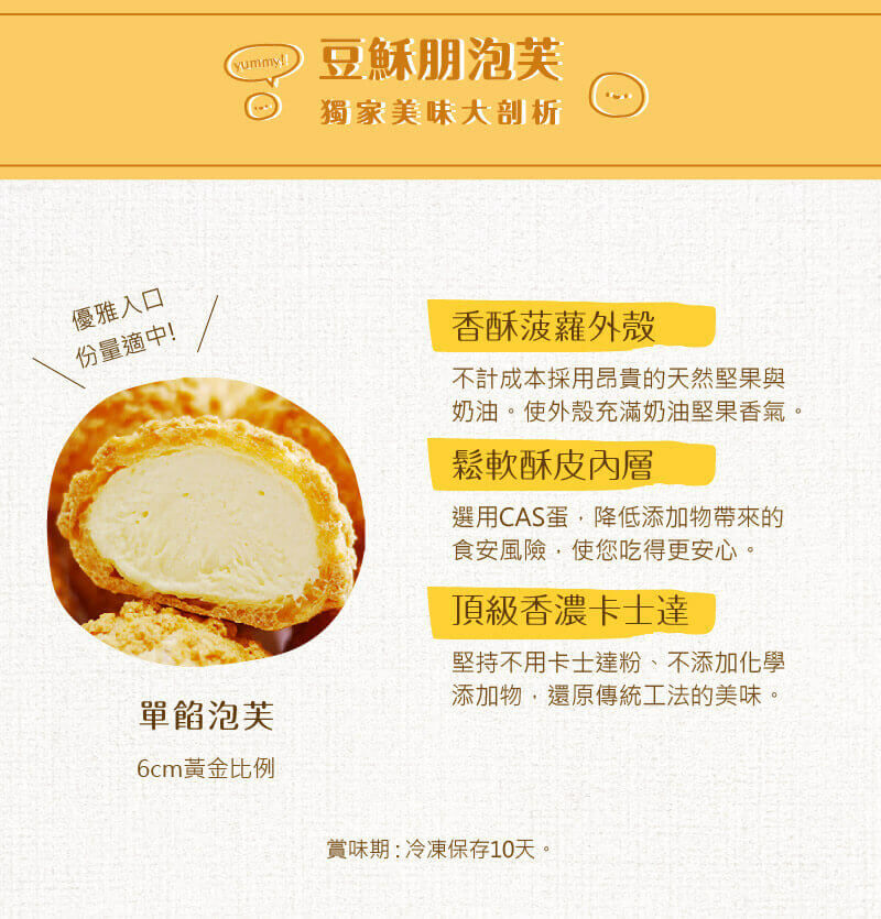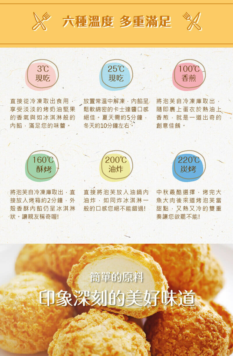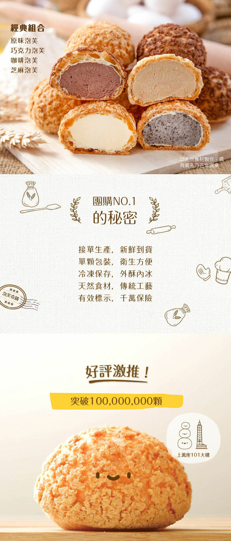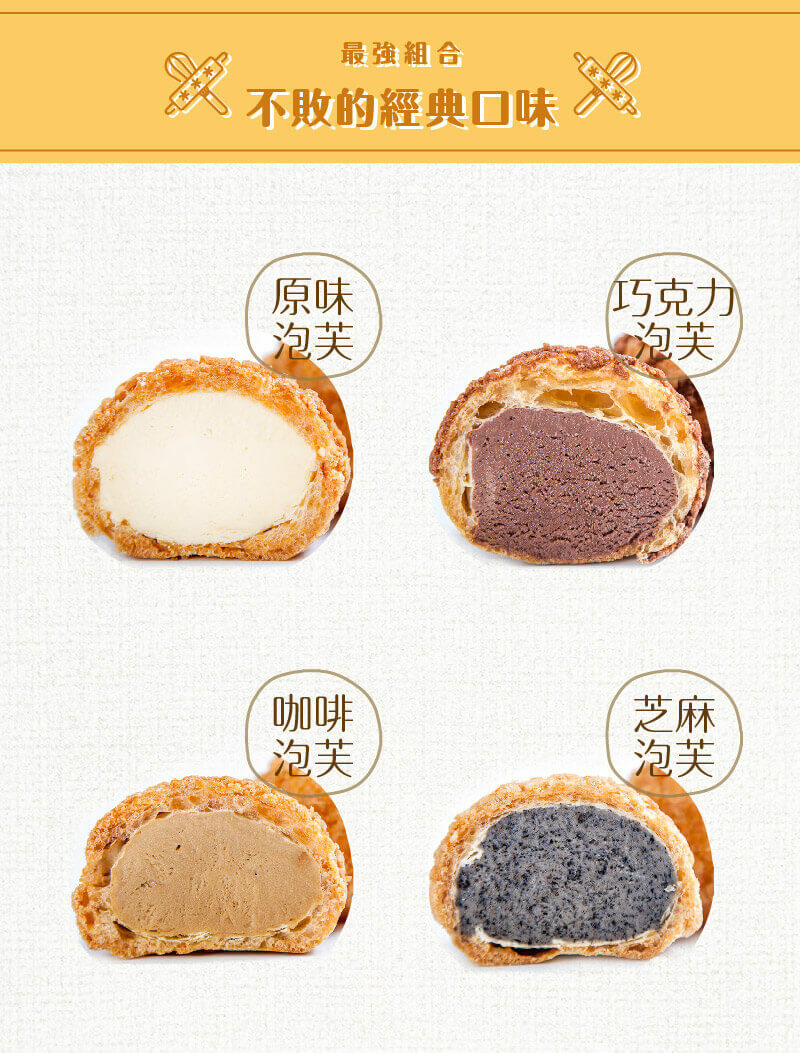 禮盒內容物:原味泡芙4入、巧克力泡芙4入、咖啡泡芙4入、芝麻泡芙4入(成分詳見各商品頁)