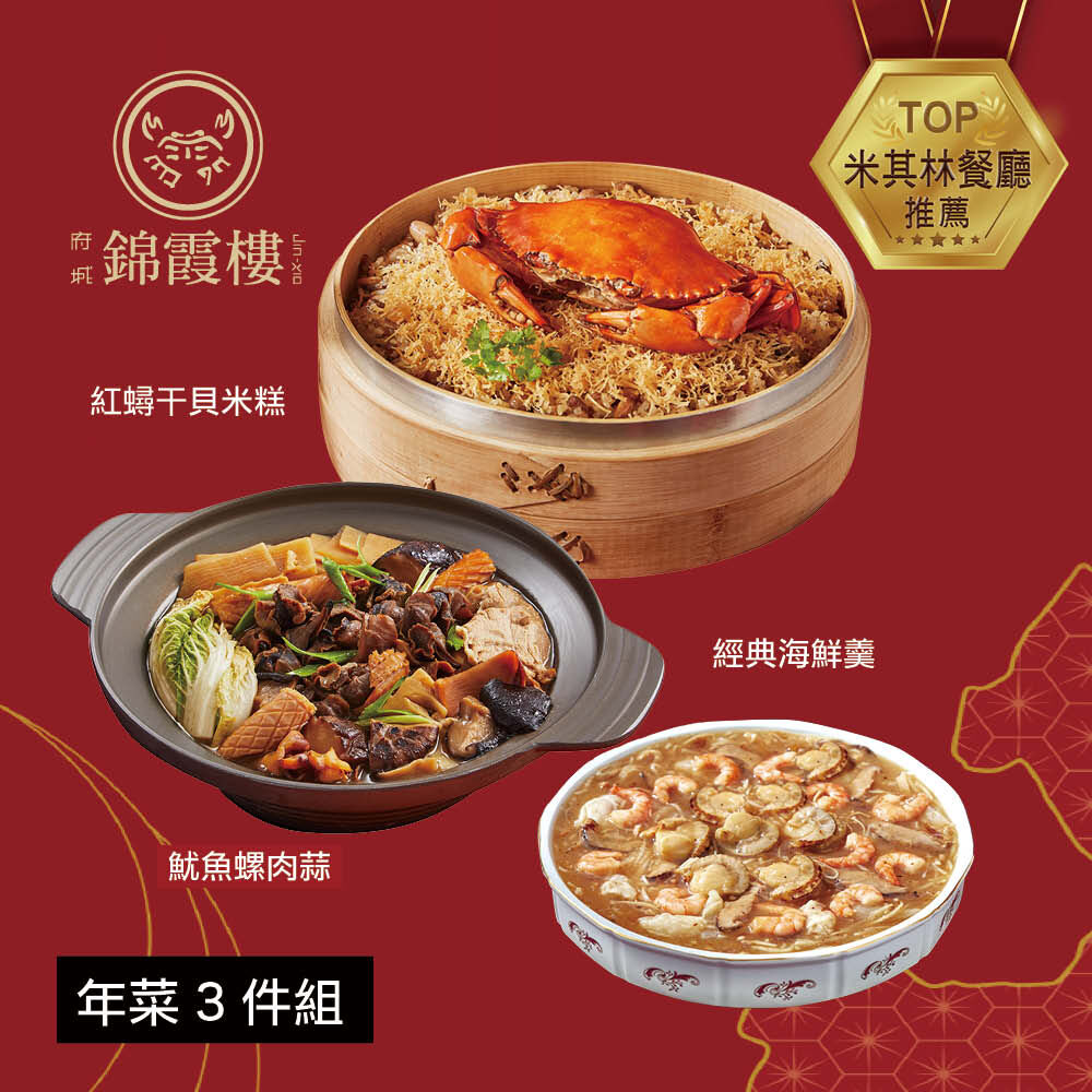 【錦霞樓】年菜3件組(紅蟳干貝米糕+經典海鮮羹+魷魚螺肉蒜)[低溫配送]