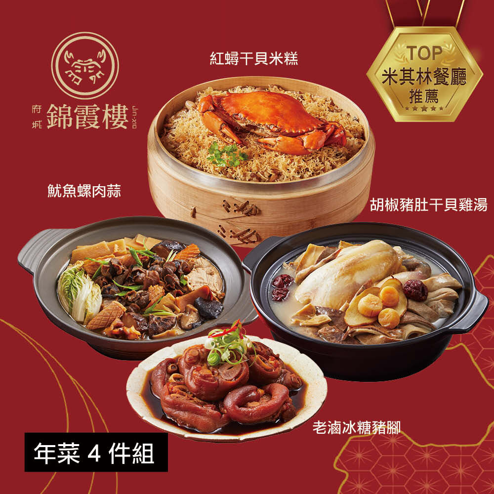 【錦霞樓】年菜4件組(紅蟳干貝米糕+胡椒豬肚干貝雞湯+老滷冰糖豬腳+魷魚螺肉蒜)[低溫配送]