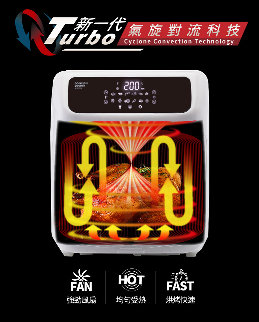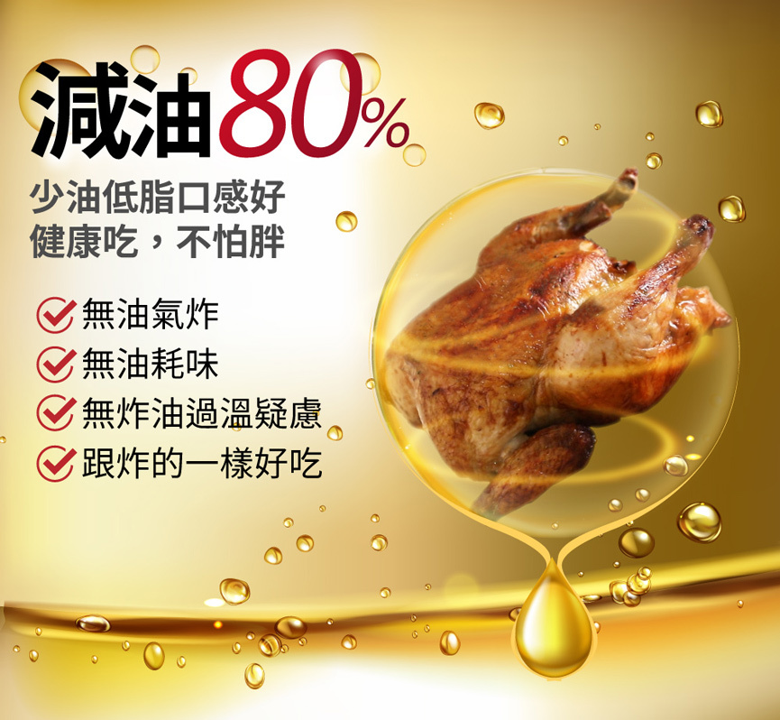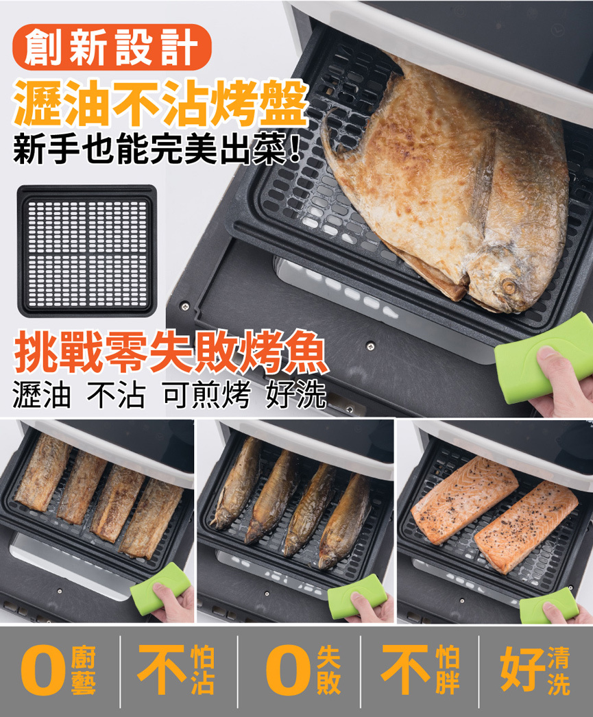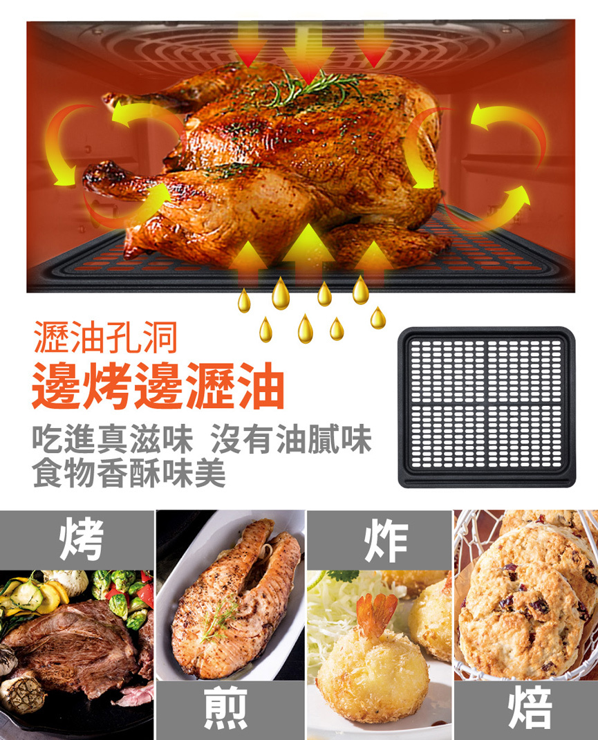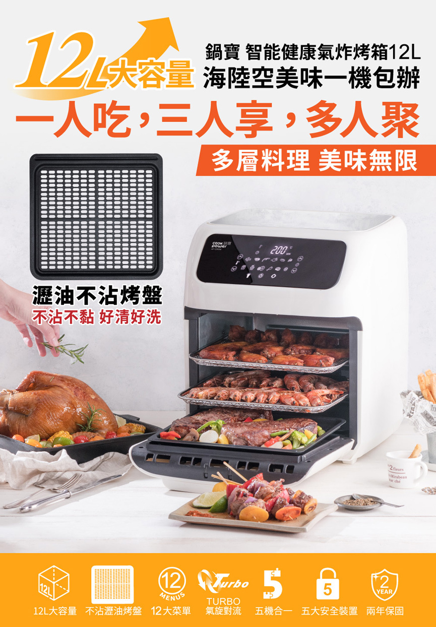 瀝油不沾烤盤超萬用 烤全魚、易沾食材都不沾 12L可烤4斤全雞,空間充分運用 多層烘烤更方便聚餐、派對都能快速上菜 TURBO+氣旋對流科技,五機合一料理多變化 智慧觸控面板,微電腦12種模式全自動烹調 全配件輕鬆做,滿足中西各式料理 少油氣炸 告別油煙油膩,減油80%更健康 五大安全裝置,確保美味烹調又安全