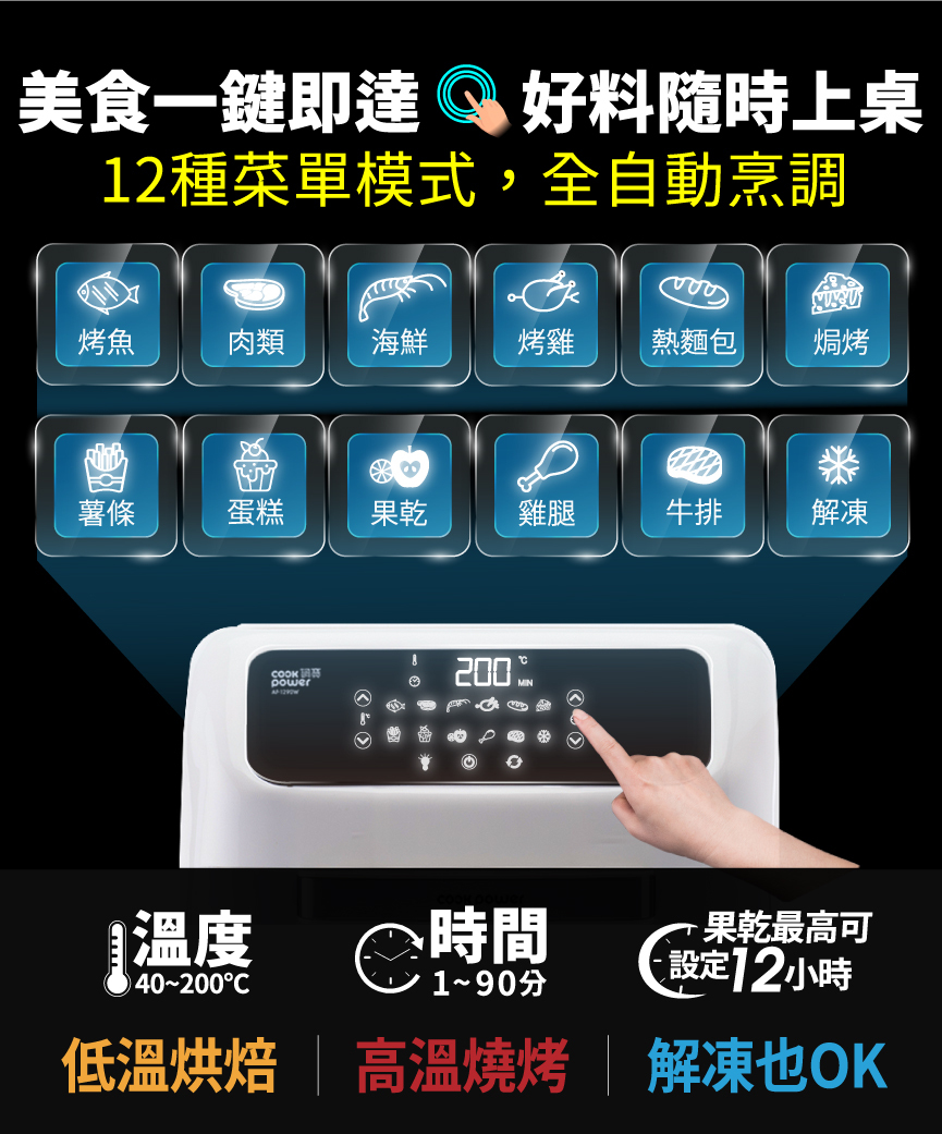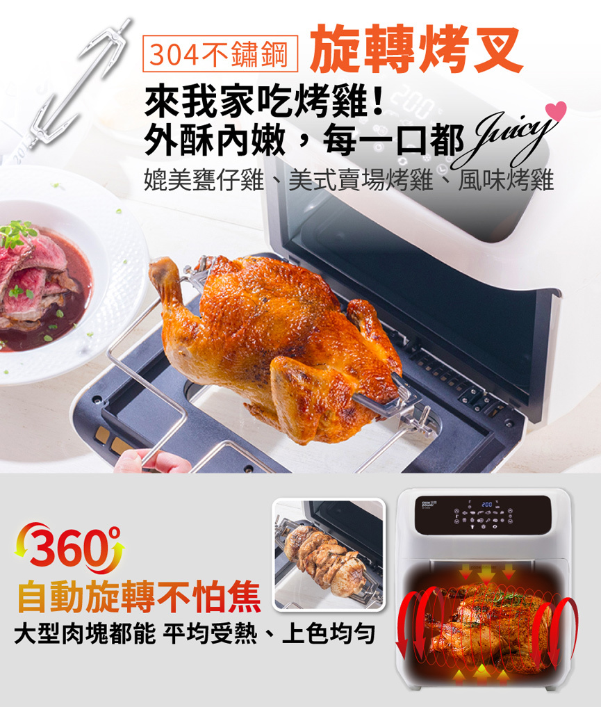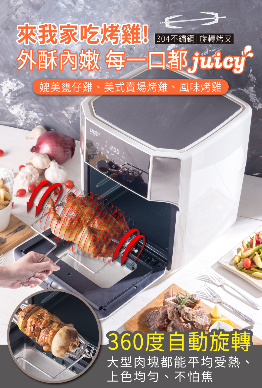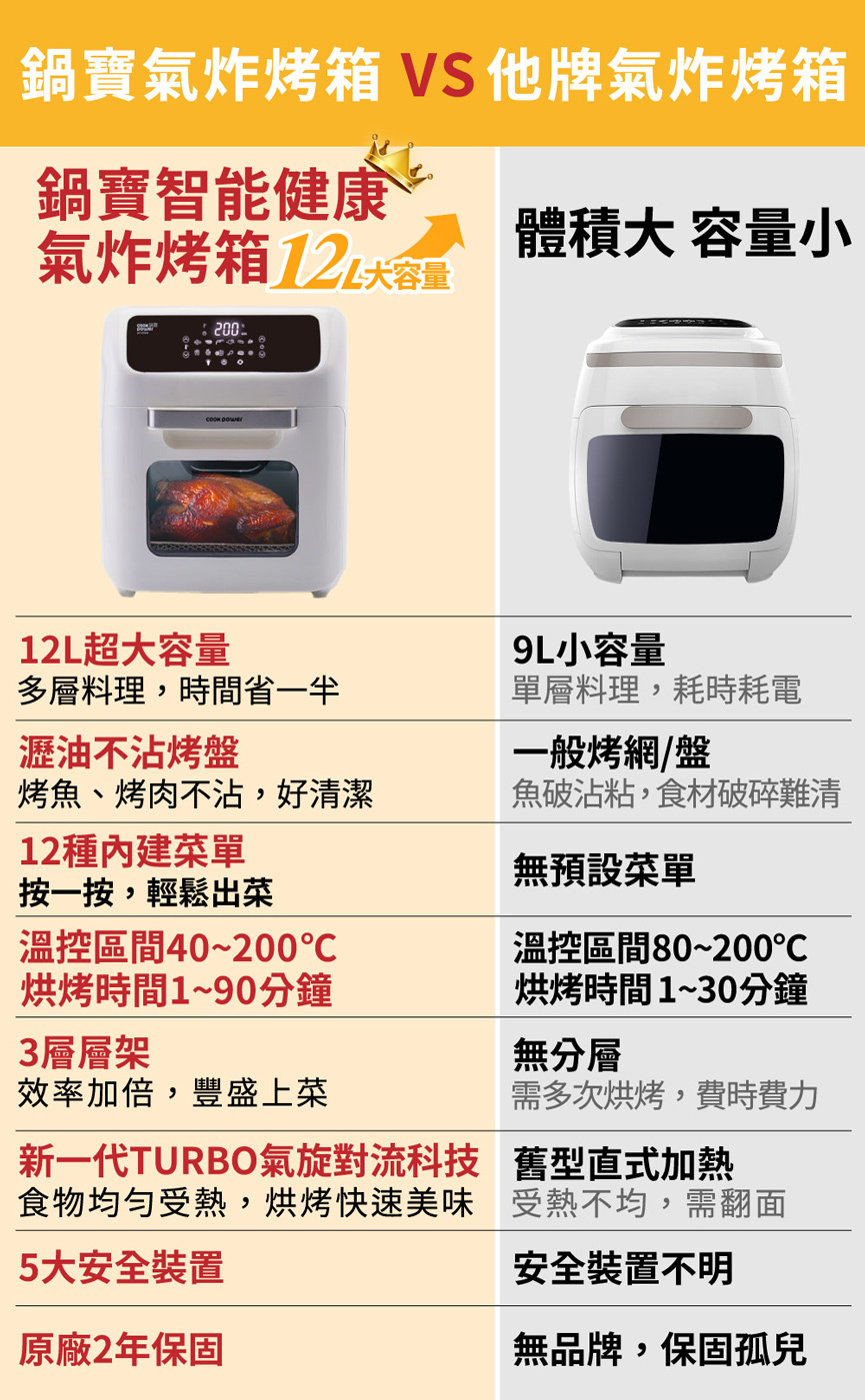 瀝油不沾烤盤超萬用 烤全魚、易沾食材都不沾 12L可烤4斤全雞,空間充分運用 多層烘烤更方便聚餐、派對都能快速上菜 TURBO+氣旋對流科技,五機合一料理多變化 智慧觸控面板,微電腦12種模式全自動烹調 全配件輕鬆做,滿足中西各式料理 少油氣炸 告別油煙油膩,減油80%更健康 五大安全裝置,確保美味烹調又安全