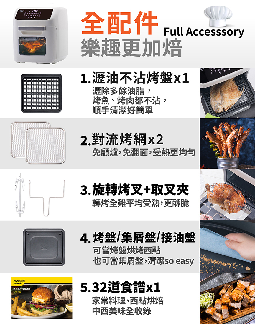 附件:瀝油不沾烤盤*1、烤網*2、接油盤*1、旋轉烤叉*1、取叉夾*1、食譜x1、說明書x1