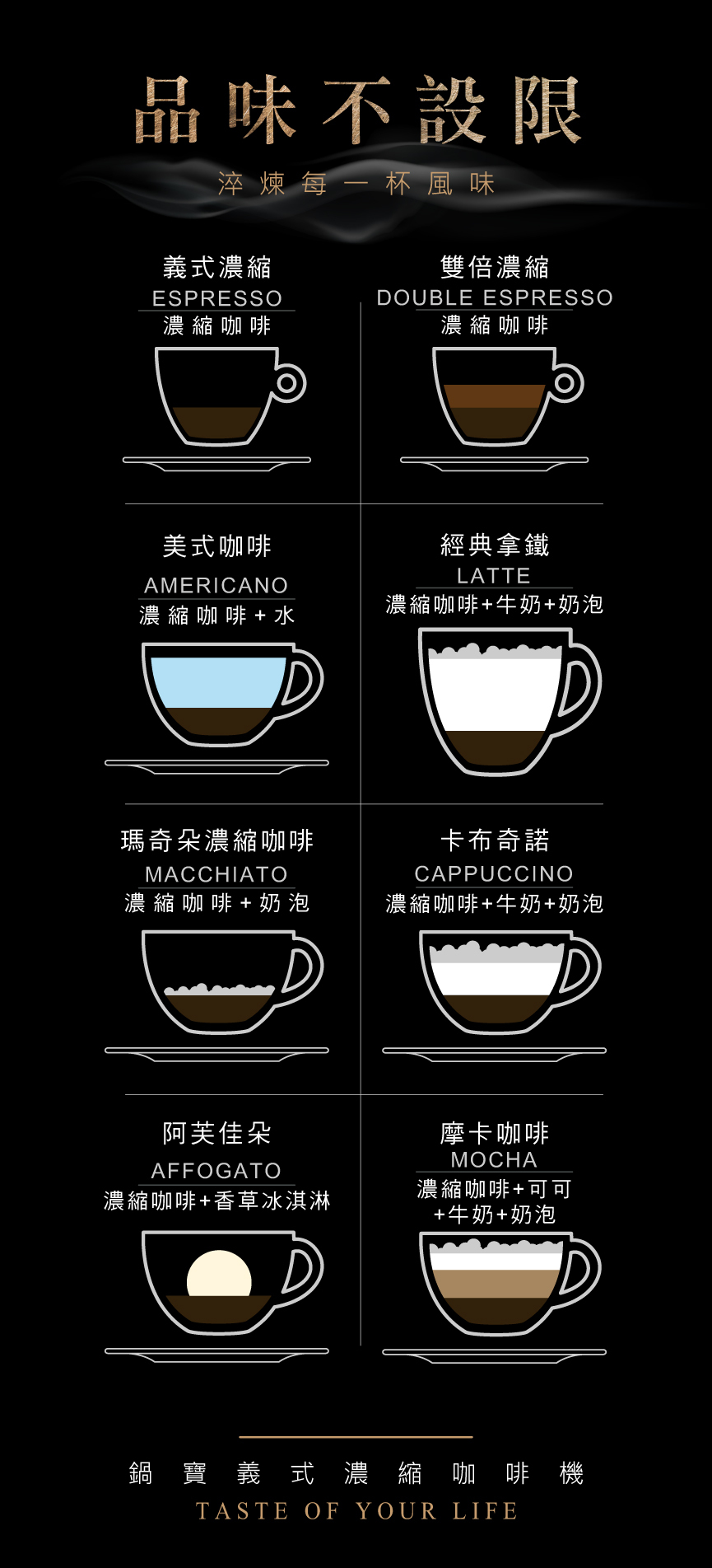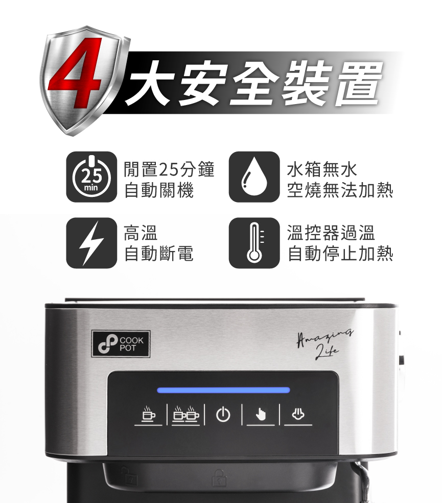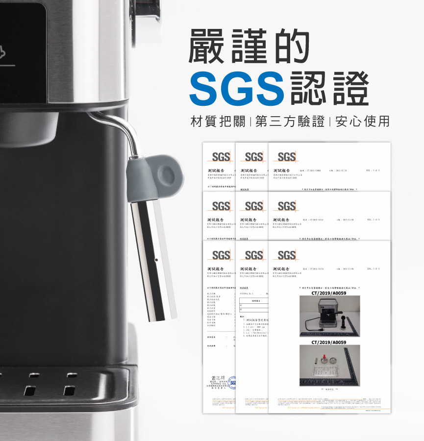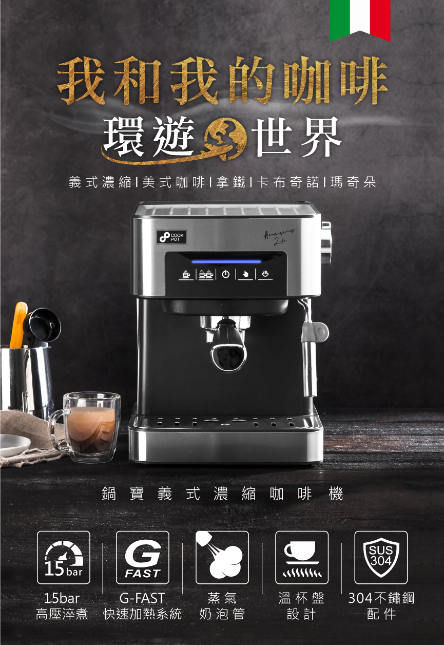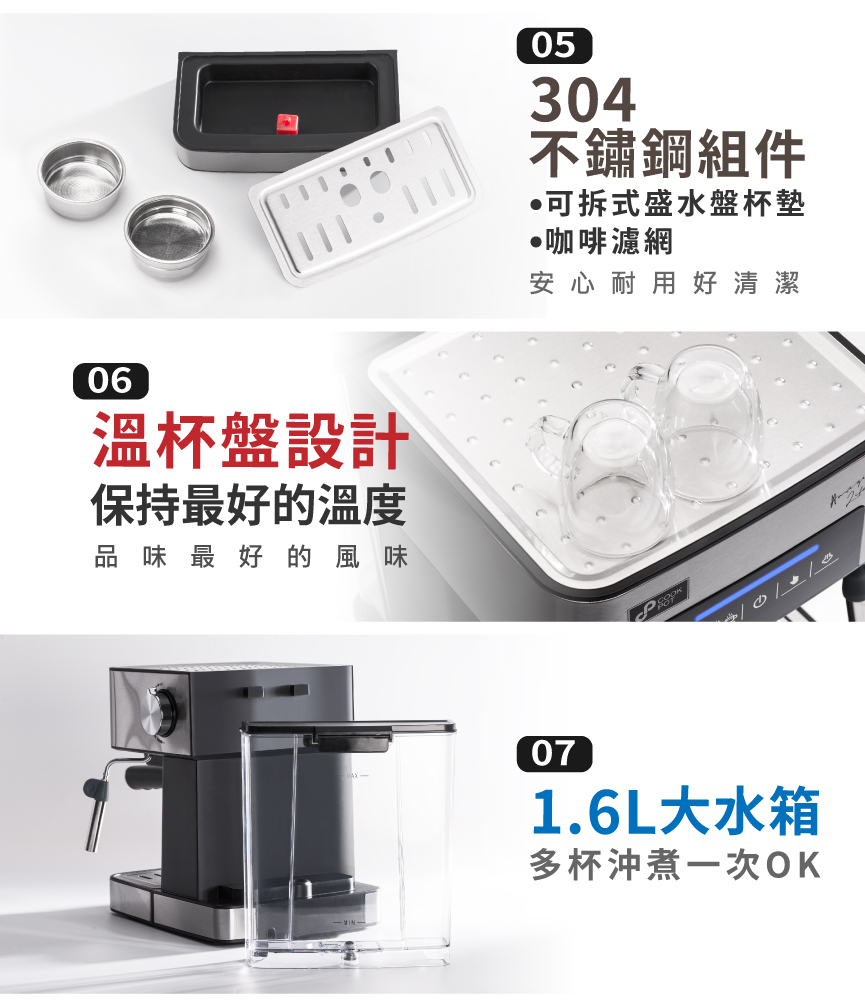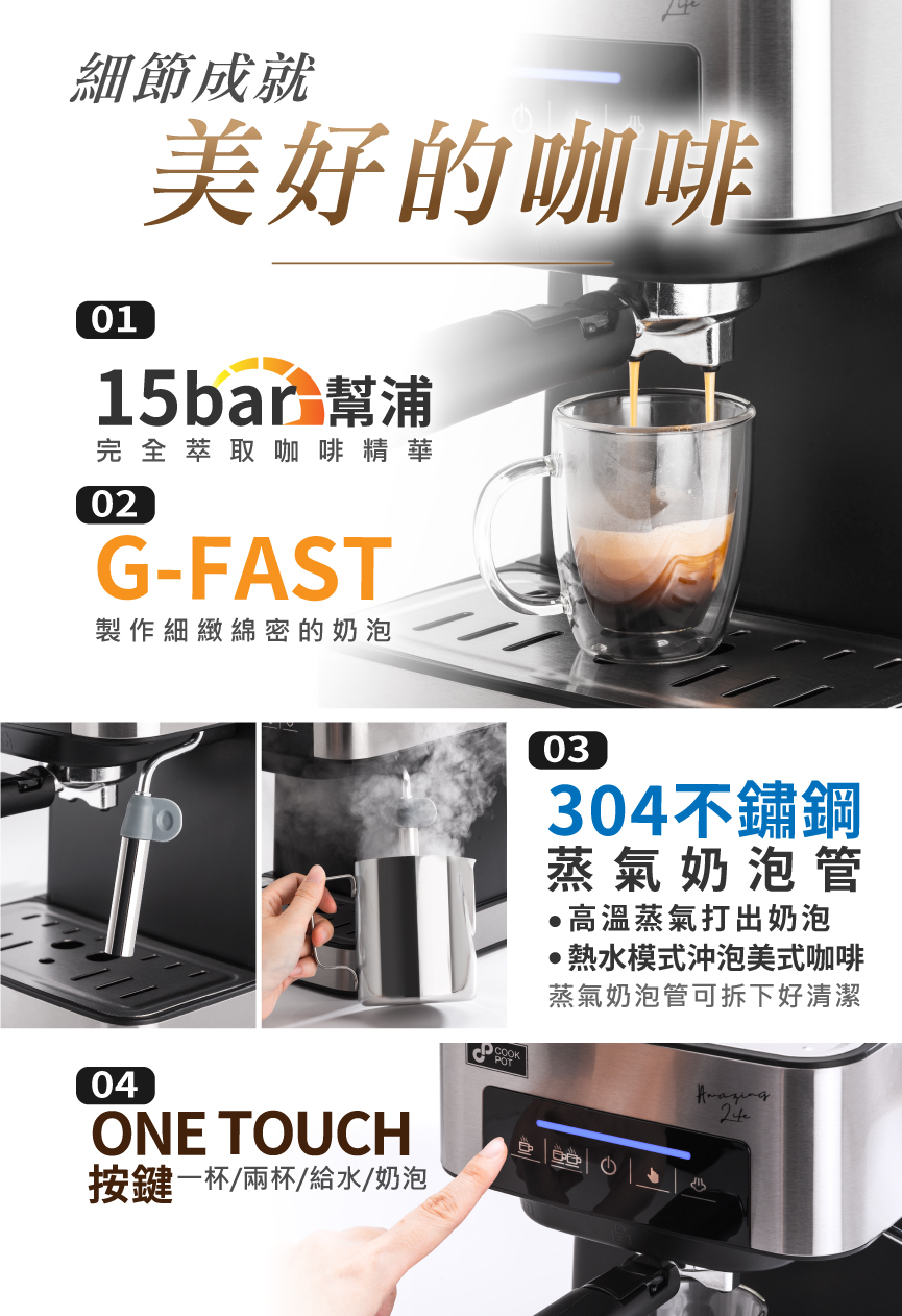 15bar幫浦完全萃取咖啡精華 採用G-FAST快速加熱系統,自動沖煮Espersso 304蒸氣奶泡管,綿密口感完美呈現 貼心溫杯盤設計,細節講究保留咖啡香醇原味 304不鏽鋼組件,耐用好清潔使用安心升級 ONE TOUCH按鍵式,操作簡便易上手 1.6L大水箱,多杯沖煮一次搞定 4大安全裝置,使用安心更放心 SGS檢驗合格,品質保證