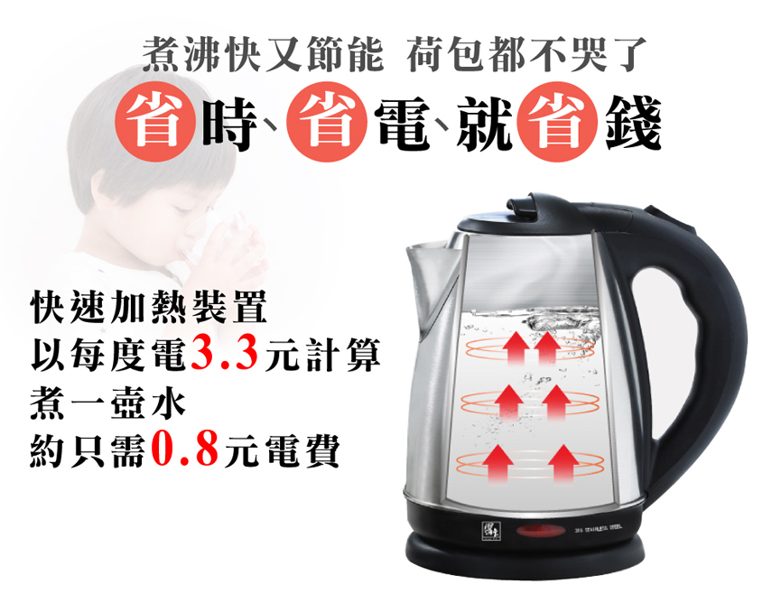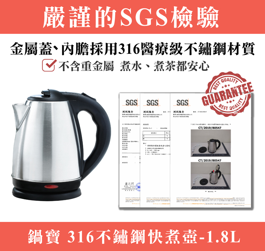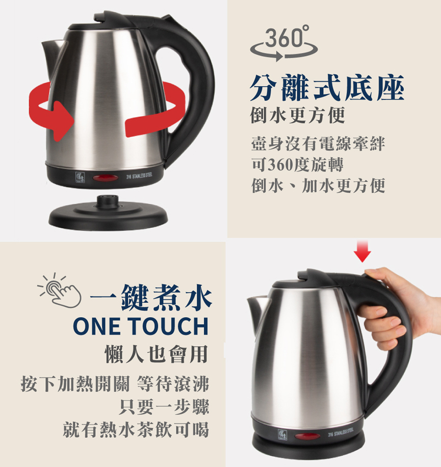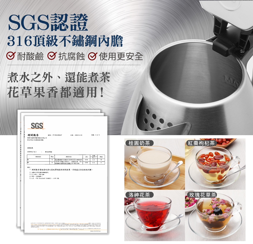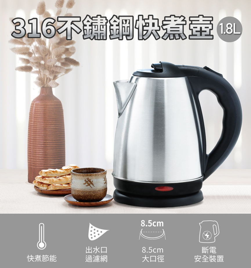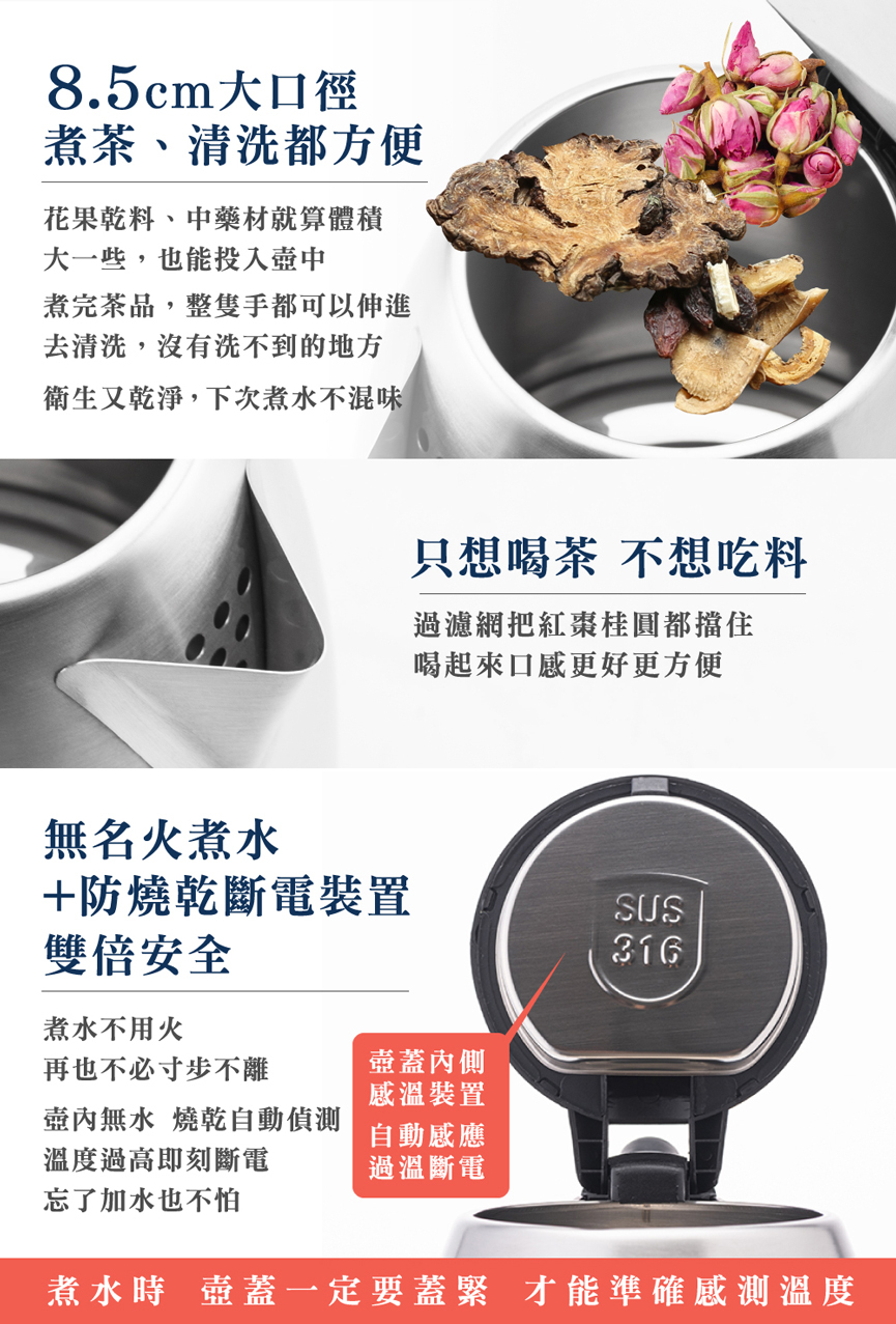 16醫療級不鏽鋼內膽,煮水、泡茶更安心。快速加熱裝置,煮沸快又節能,省時省電又省錢。內蓋感溫裝置,一旦過溫即斷電,層層安全保障。分離式機身,倒水無電線牽絆,更方便。壺身+內蓋採用316頂級不鏽鋼,防腐蝕更耐酸鹼。8.5cm大口徑,加入茶葉、清洗內膽都方便。出水口貼心濾網可濾渣,方便煮各式茶品。