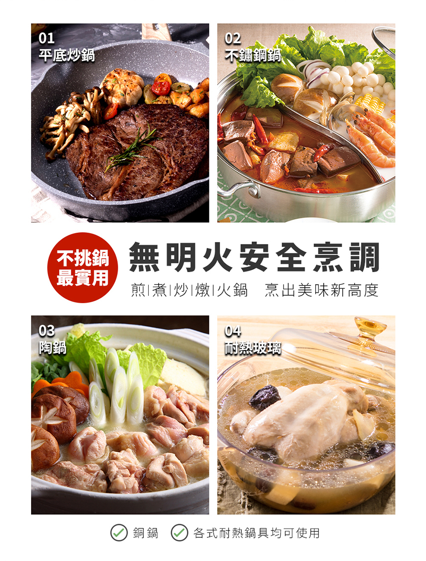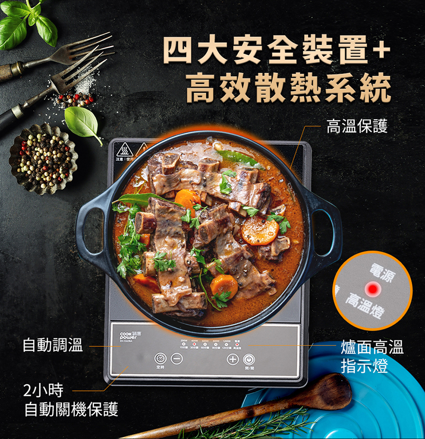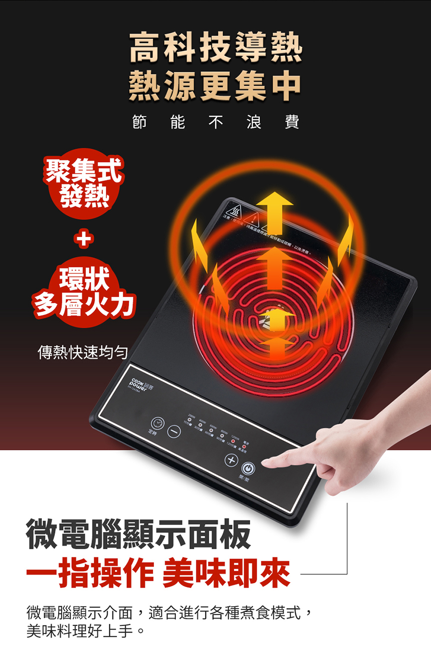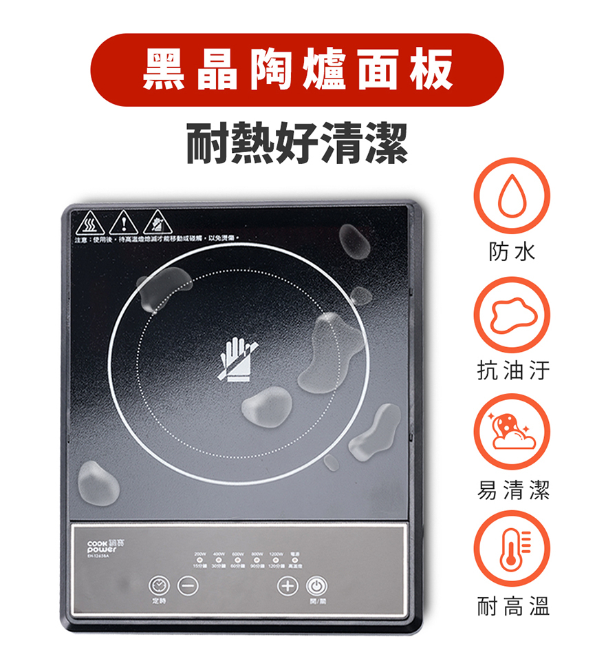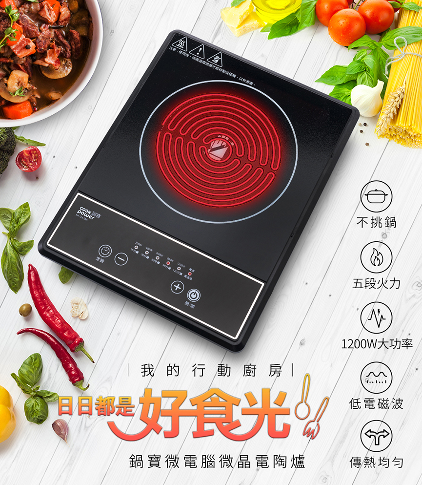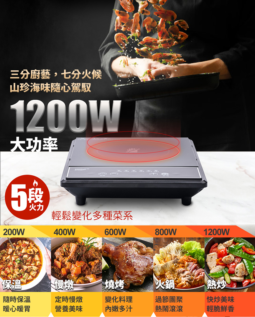不挑鍋具,煎煮炒燉火鍋都OK5段火力+1200W大功率,溫度操控隨心所欲高科技導熱技術,熱源更集中LED微電腦顯示介面,簡單易操作耐熱微晶防水玻璃面板,好清潔,輕鬆省力