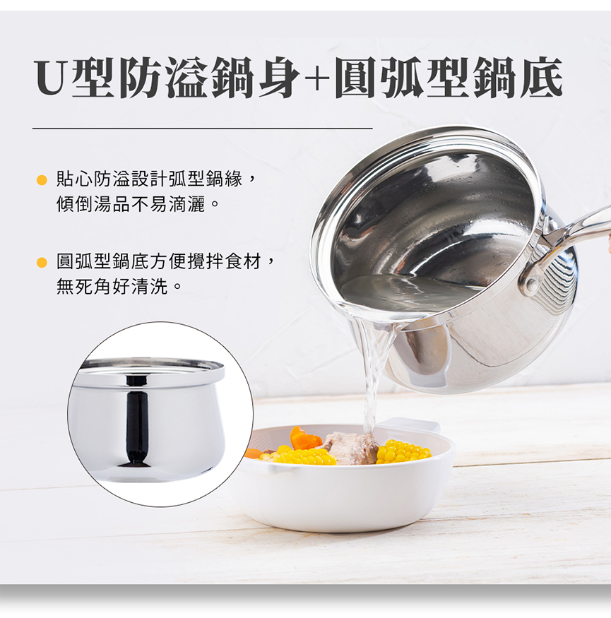 ● U 型防溢鍋身+圓弧型鍋底,無死角好清洗。