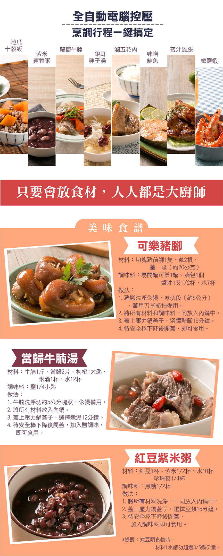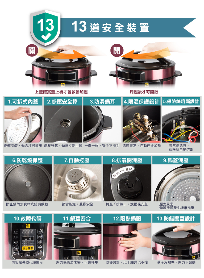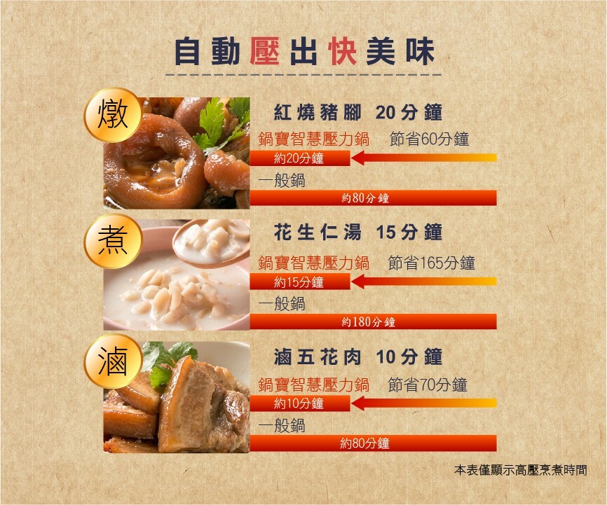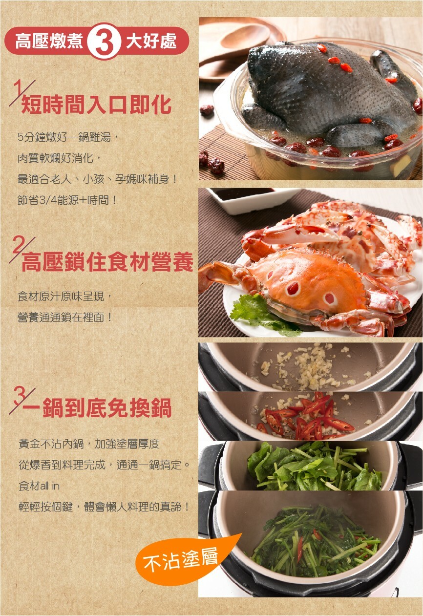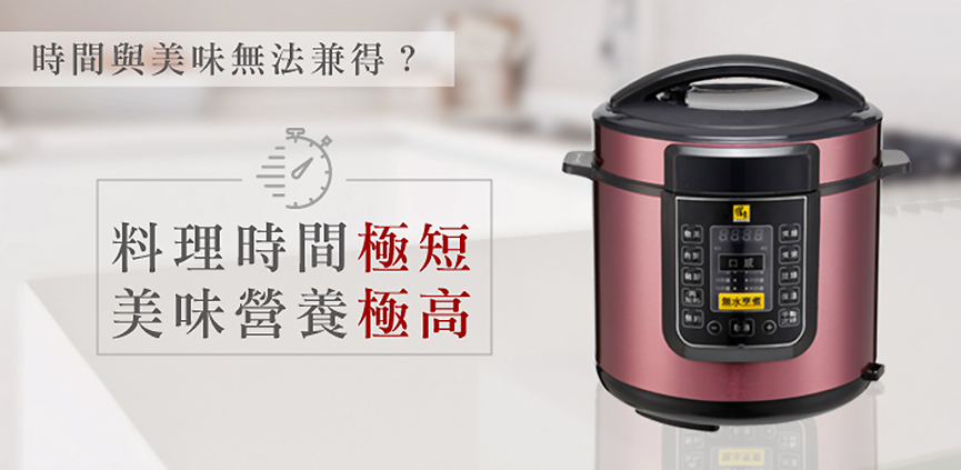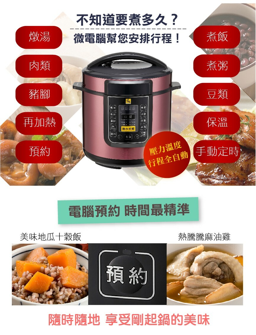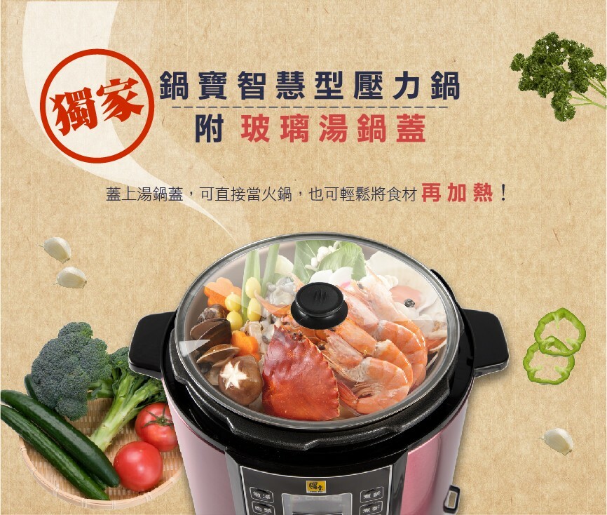 智慧萬用鍋(壓力鍋),蒸煮燉滷省時又節能。 黃金不沾內鍋萬用好洗,塗層厚度加強更耐用。 特殊無水烹調功能,無水煎烤一鍋萬用。 13道安全防護設計,免看顧更安心。 預約功能,微電腦行程安排烹煮,貼近智慧生活。 內蓋、集水盒、洩壓閥可拆好洗,保持乾淨煮食更衛生。 隨鍋附贈強化玻璃蓋,煮湯、煮火鍋用途更廣。 燉豬腳20分鐘、花生湯15分鐘、滷五花肉只要10分鐘!