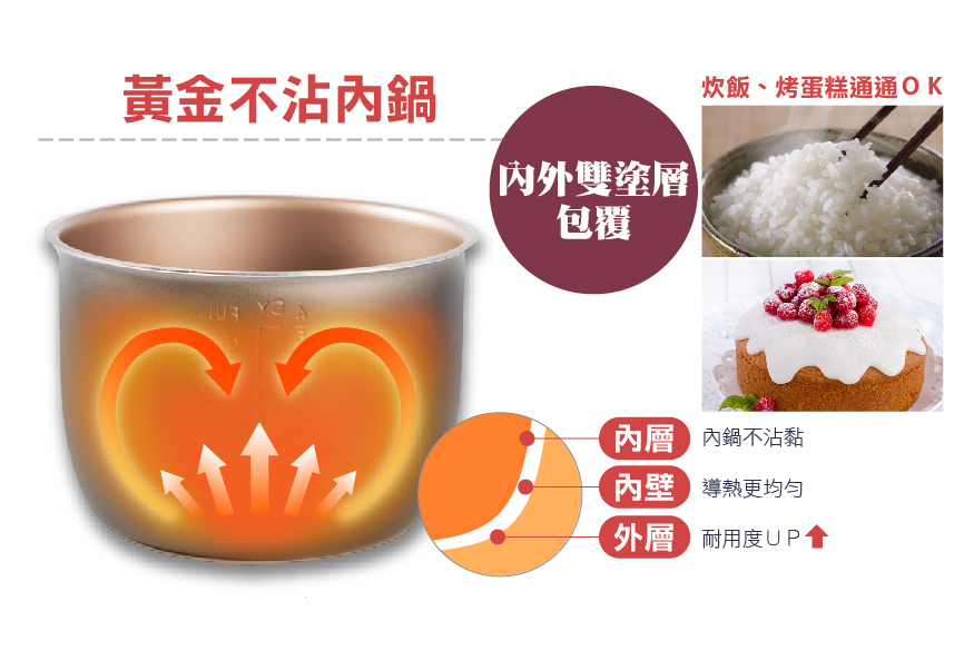 材質:內鍋-高科技雙層不沾材質;外殼-不銹鋼+耐熱PP(聚丙烯)