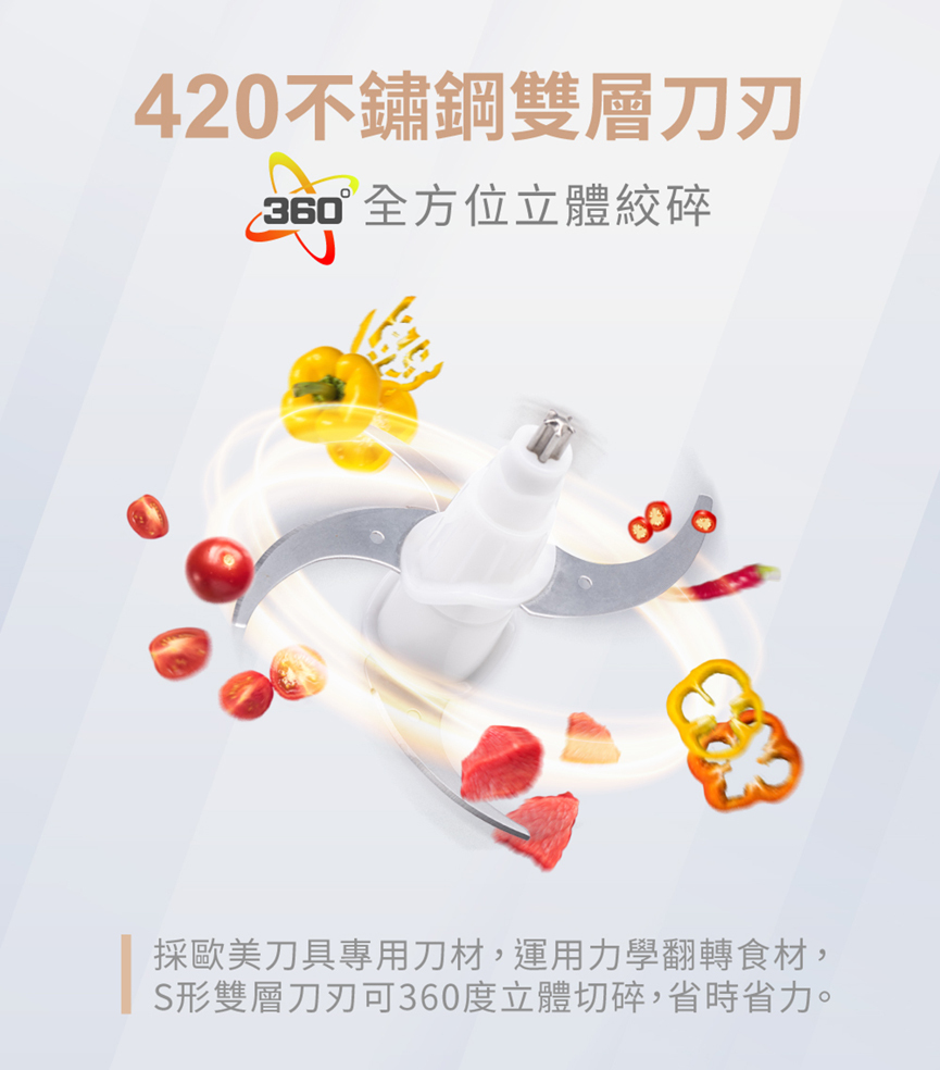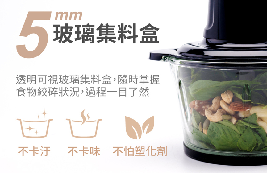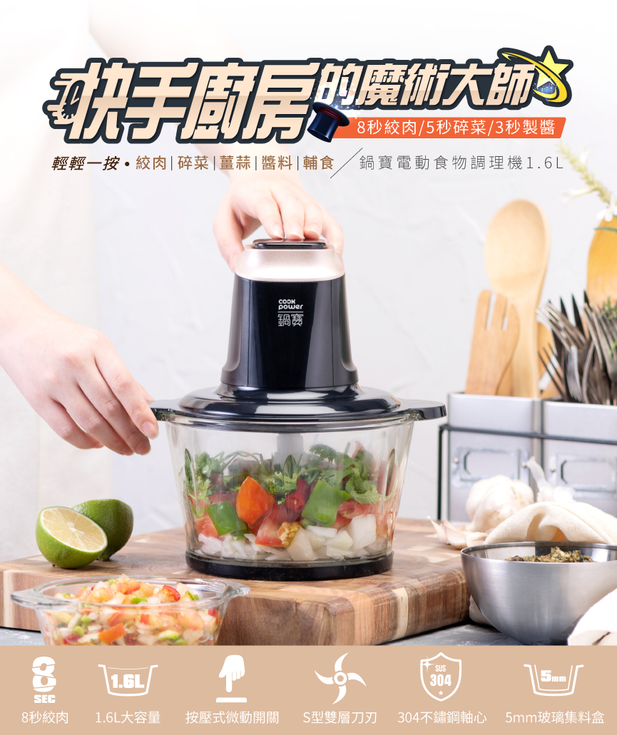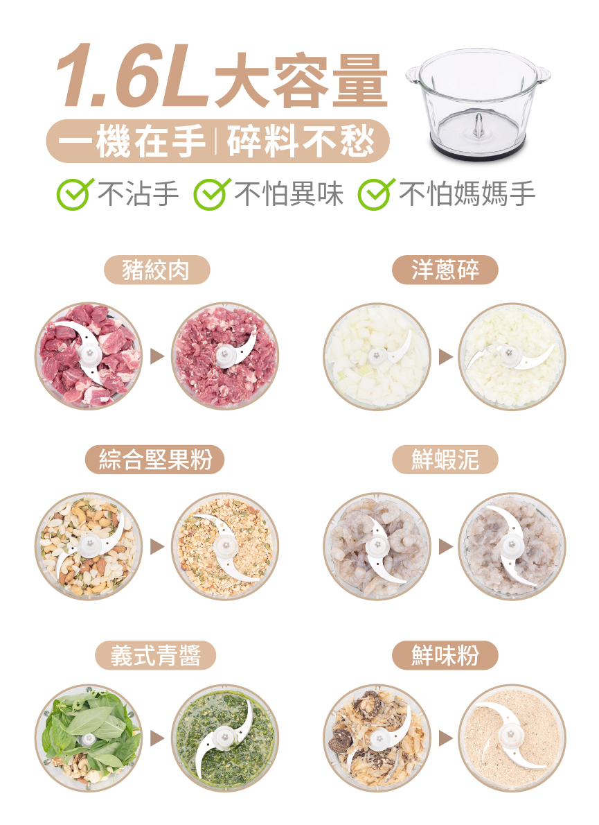 1.6公升大容量,一次備齊所有食材電動免沾手微動開關,粗細好掌握海鮮、肉類、堅果、肉餡、肉丸、醬料…一機多用420不鏽鋼雙層刀刃,360度立體絞碎5mm玻璃集料盒,料理食材不卡味304不鏽鋼軸心,防滑底座使用穩固配件易拆好安裝,清洗容易好收納