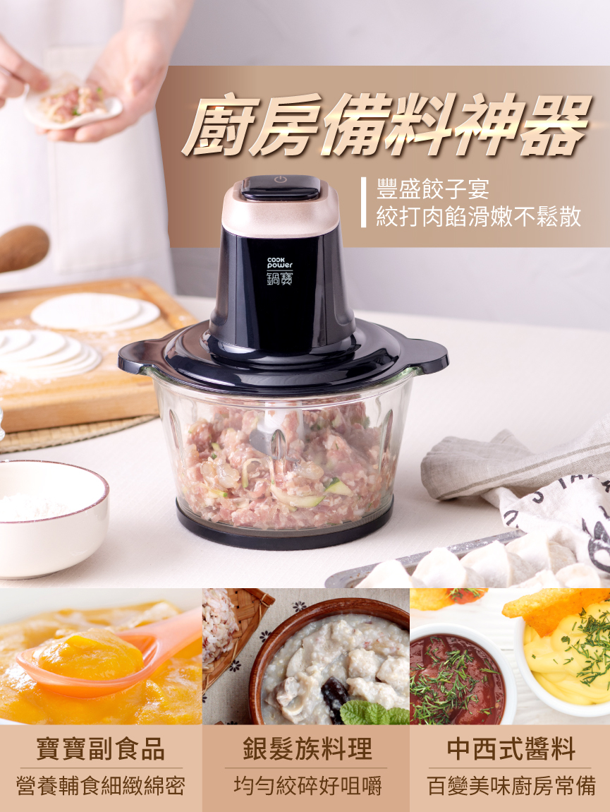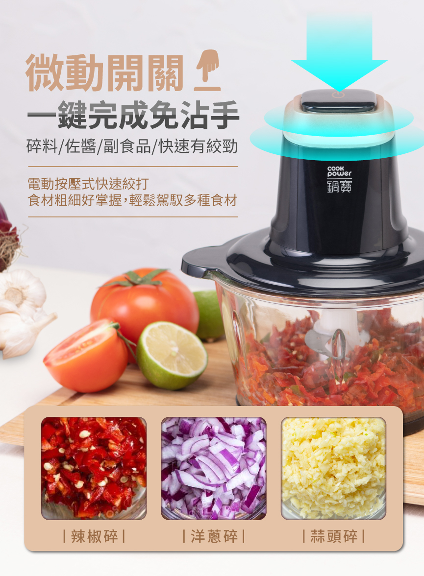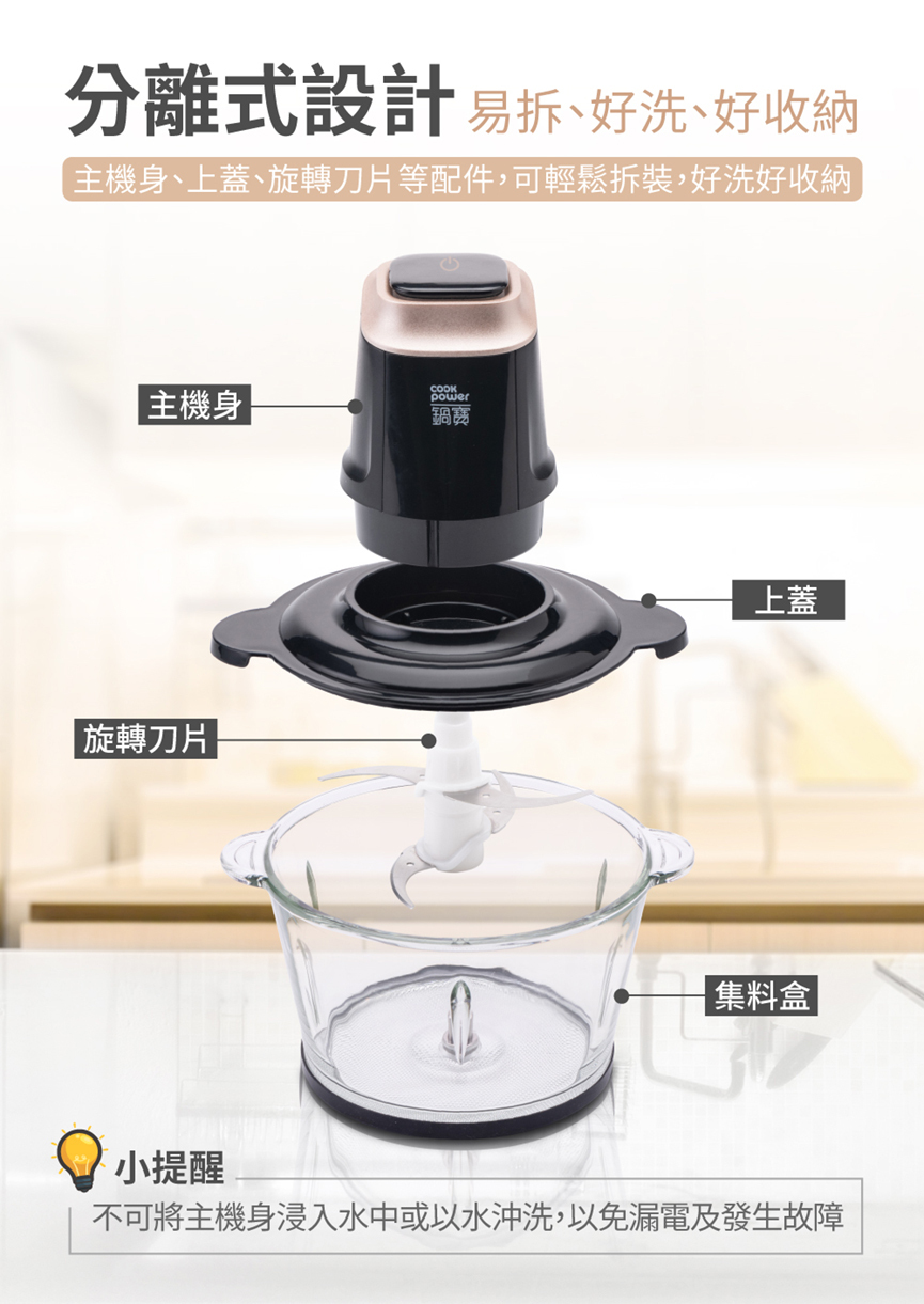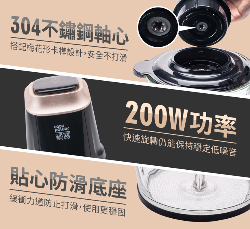1.6公升大容量,一次備齊所有食材電動免沾手微動開關,粗細好掌握海鮮、肉類、堅果、肉餡、肉丸、醬料…一機多用420不鏽鋼雙層刀刃,360度立體絞碎5mm玻璃集料盒,料理食材不卡味304不鏽鋼軸心,防滑底座使用穩固配件易拆好安裝,清洗容易好收納