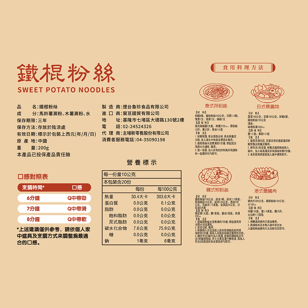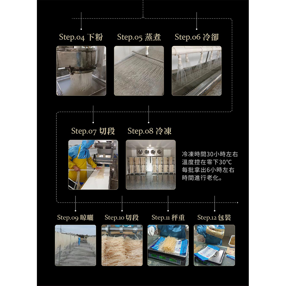 食用方法:鐵棍粉絲使用前建議用量水泡兩個小時以上減少煮的時間,如若無泡水,煮沸時間約8-10分鐘再根據個人洗好涼拌、涮煮、蒸烤