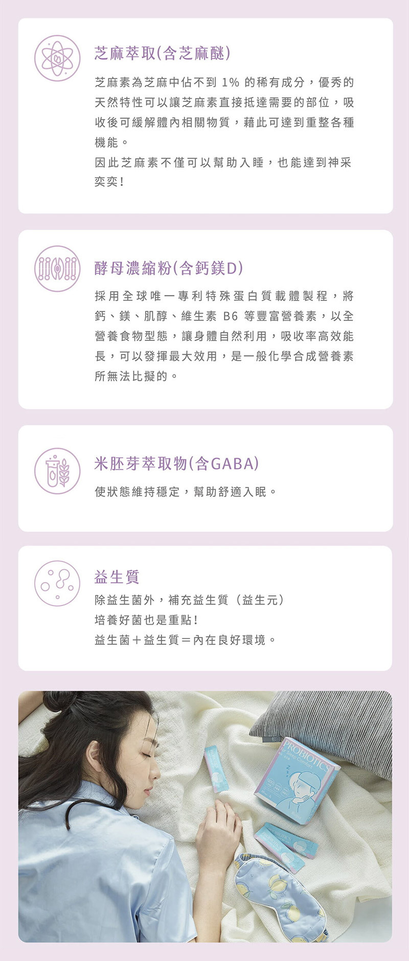 ✔芝麻醚、GABA、鈣鎂D,三效循環,幫助放鬆安定