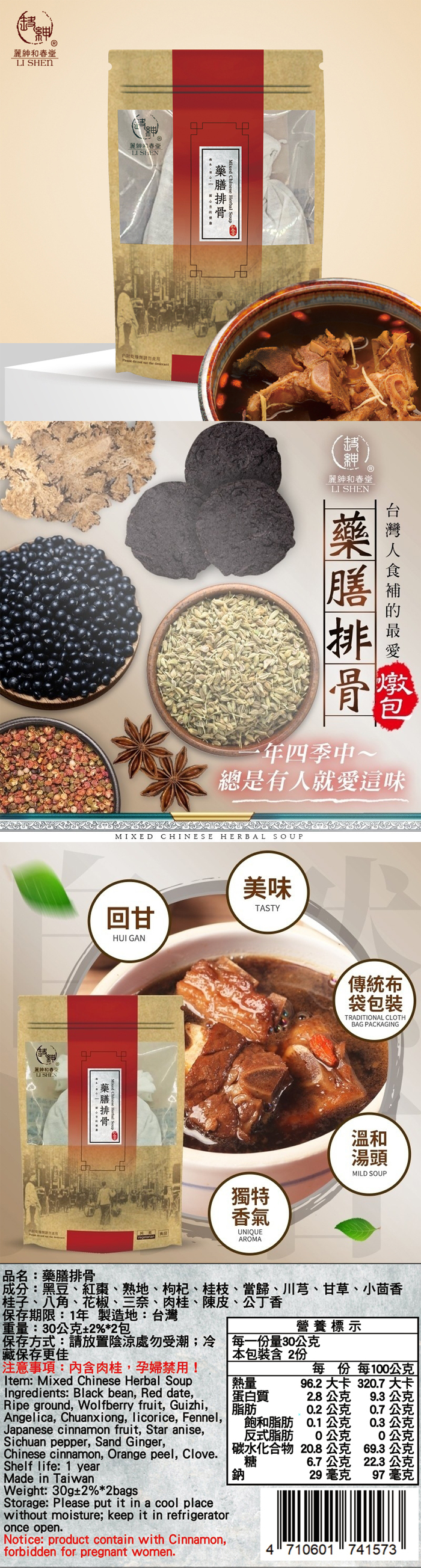 成分:黑豆、紅棗、熟地、枸杞、桂枝、當歸、川芎、甘草、小茴香、桂子、八角、花椒、三奈、肉桂、陳皮、公丁香